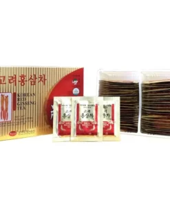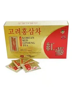 Trà hồng sâm – KGS Thành phần: nước tinh khiết, isomalto-oligosaccharides, 0,36% tinh chất hồng sâm Hàn Quốc 6 năm tuổi cô đặc (thành phần rắn 60%, thành phần hồng sâm trên 70 mg/ g), thực vật hỗn hợp cô đặc ( táo tàu Hàn Quốc, gừng khô Hàn Quốc, quế, kỷ tử), dextrin, mạch nha, axit citric, chất tạo hương tổng hợp (hương thảo mộc). Công dụng: Giúp tăng cường lưu thong khí huyết cho cơ thể. Làm giảm các tác nhân gây ra lão hóa cho cơ thể. Dùng để bồi bổ và nâng cao sức khỏe, sinh lực cho người già, người mới ốm dậy. Sản phẩm có thể dùng được cho những người bị huyết áp. Giúp cải thiện đáng kể mất ngủ, biếng ăn, lo âu dẫn đến cơ thể mệt mỏi. Giảm các triệu chứng mệt mỏi stress do lao động quá sức, làm việc nhiều.. Đối tượng sử dụng: Dùng cho những người cần nâng cao sức khỏe, tăng cường sức đề kháng cho cơ thể, người già yếu. Công nhân, nhân viên văn phòng sinh viên học sinh chịu nhiều áp lực trong công việc, trong học tập. Người bệnh mới ốm dậy, người muốn phục hồi sức khỏe sau khi mổ…. người bị cơ thể mệt mỏi, lo âu, mất ngủ. Làm món quà biếu sức khỏe cho mọi người.. Cách dùng: Ngày 2 lần, mỗi lần 2 gói, pha với nước ấm, cho thêm ít mật ong tùy thích. Không dùng cho trẻ em dưới 6 tuổi. Không dùng vào buổi tối trước khi đi ngủ, dễ bị kích thích thần kinh gây ra khó ngủ.